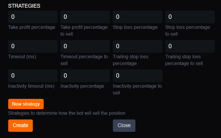 Let's assume this is the strategy input: 100:50:50:100---300:100:50:100 and your initial amount is 1 SOL Let's break down the strategy input - 1 strategy: My take profit percentage is 100% and take profit percentage to sell is 50%. With 1 SOL initial entry this take profit strategy will be triggered only if my position value is gonna be 2 SOL and Im gonna sell some amount of tokens which worth 1 SOL. I'm left with 1 SOL My stop loss percentage is 50% and stop loss percentage to sell is 100%. With 1 SOL initial entry this stop loss strategy will be triggered only if my position value is gonna be 0.5 SOL and Im gonna sell 100% of the tokens I have - 2 strategy: My take profit percentage is 300% and take profit percentage to sell is 100%. With 1 SOL initial entry this take profit strategy will be triggered only if my position value is gonna be 4 SOL and Im gonna sell 100% of the tokens I have. I'm left with 0 SOL -> position will be closed by the bot My stop loss percentage is 50% and stop loss percentage to sell is 100%. With 1 SOL initial entry this stop loss strategy will be triggered only if my position value is gonna be 0.5 SOL and Im gonna sell 100% of the tokens I have So it does not matter what was the position value after strategy is triggered, we still use pre-calculated values You should keep in mind that incorrectly setting up trigger and sell percentages can lead to "incorrect" flow. For example, if we gonna change the 1st strategy's take profit percentage to sell to 75% instead of 50% after sell we gonna be left with 0.5 position value which is basically our stop loss value.